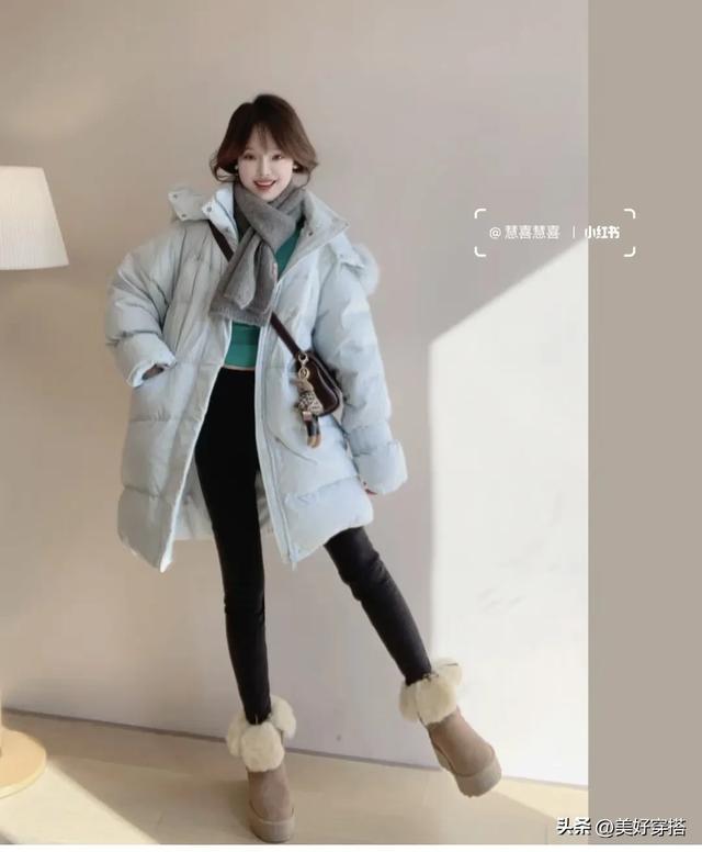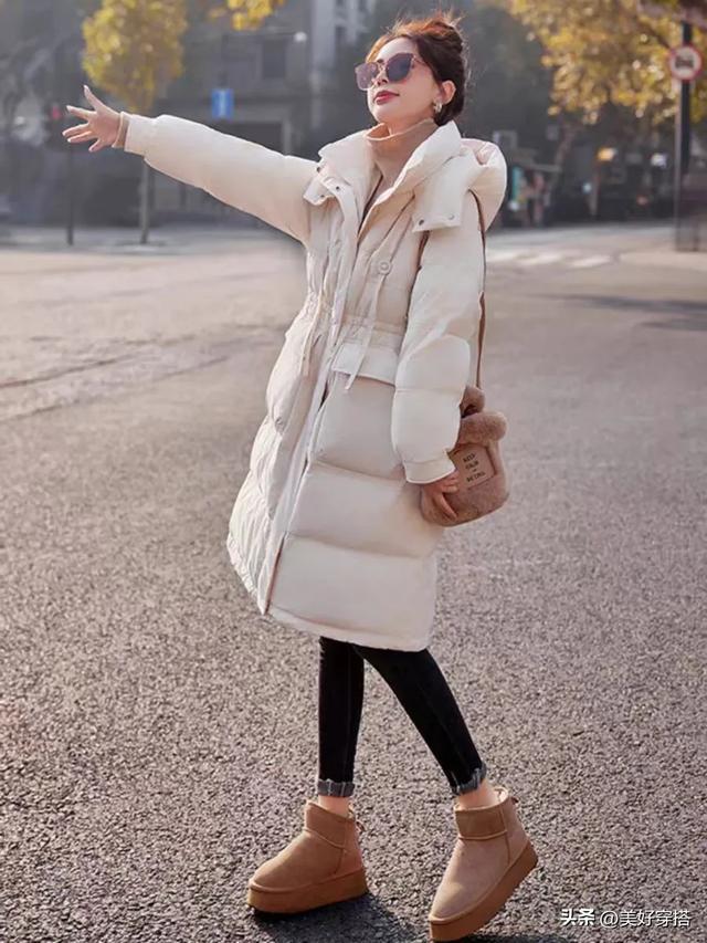 脚下穿一双简约的小白鞋或者雪地靴,皮靴,长筒靴都是不错的选择。