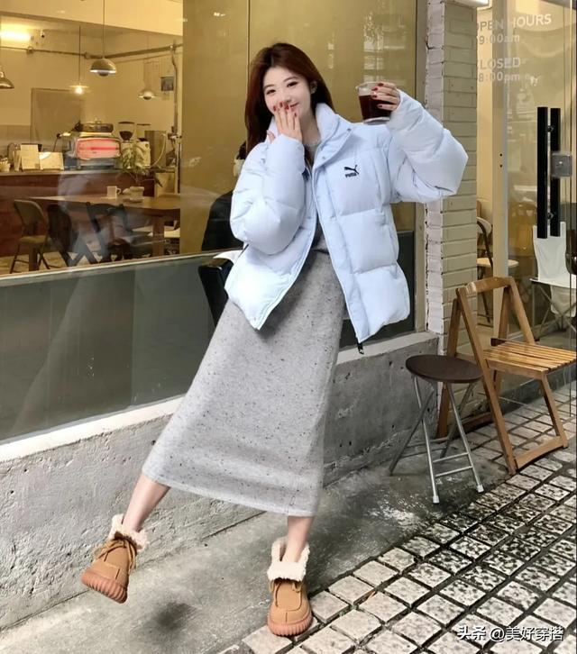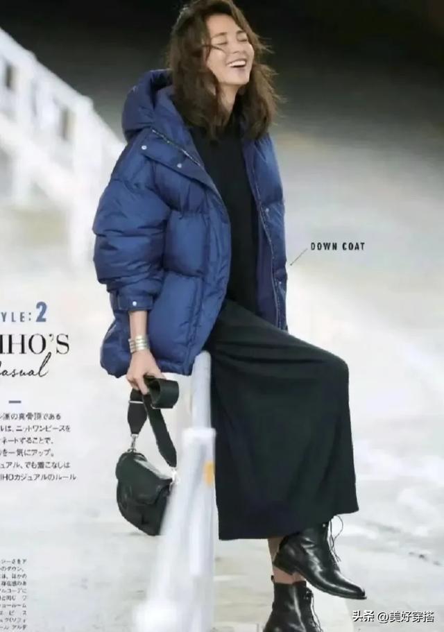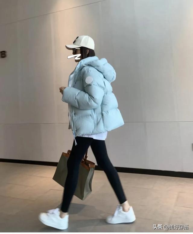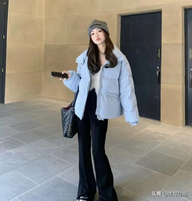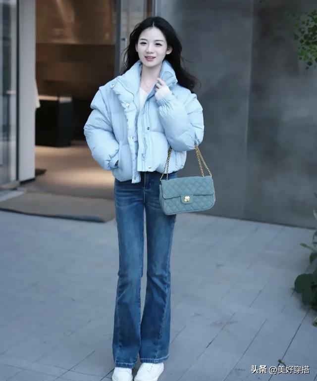 其中,灰蓝色的羽绒服最显白,搭配白色的内搭和黑色的裤子,比如喇叭裤,鲨鱼裤,牛仔裤,都很有减龄感,不管什么年纪穿都能驾驭。