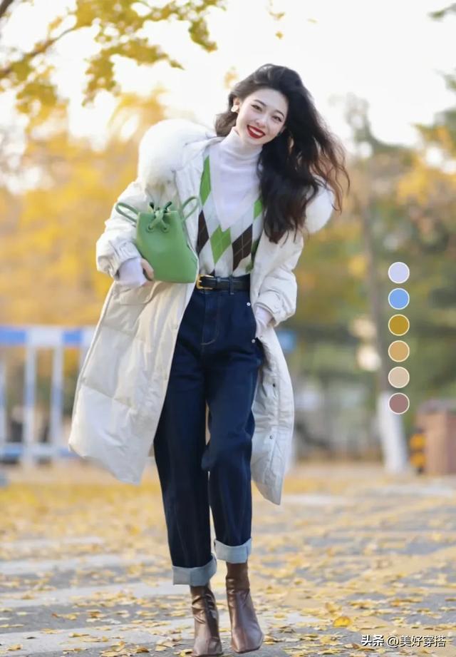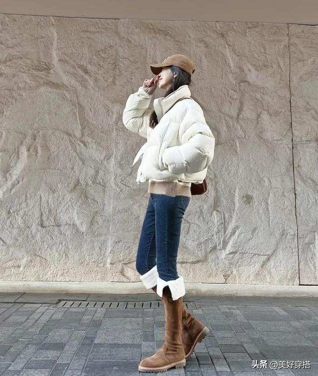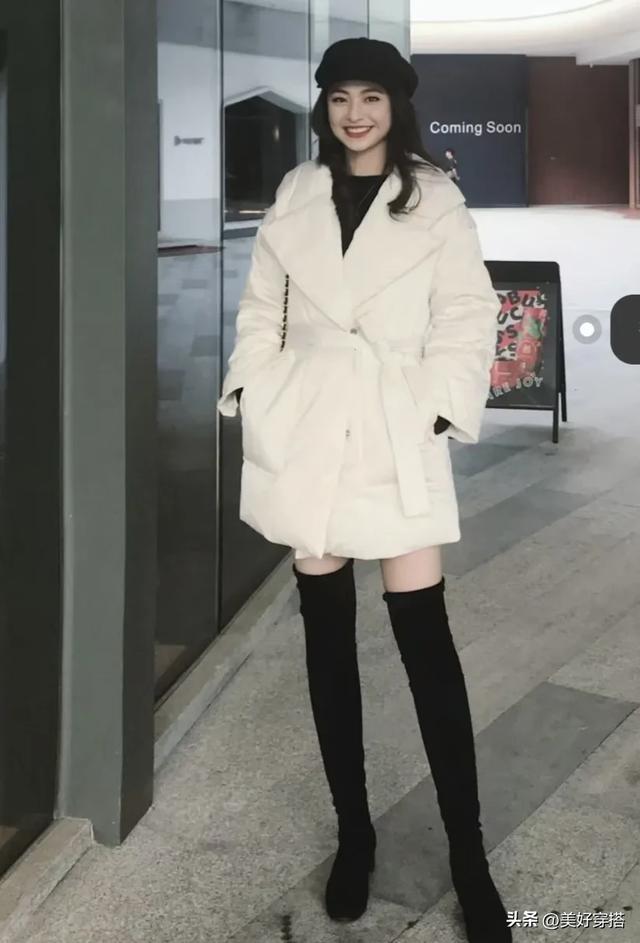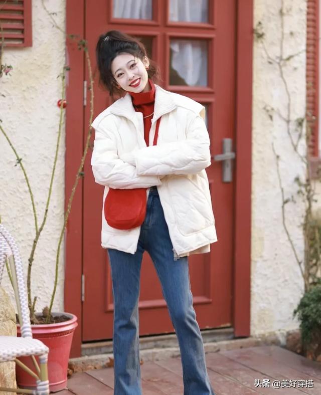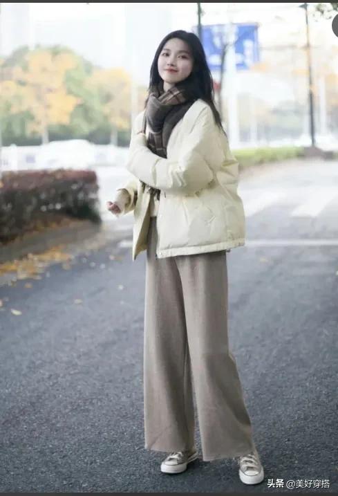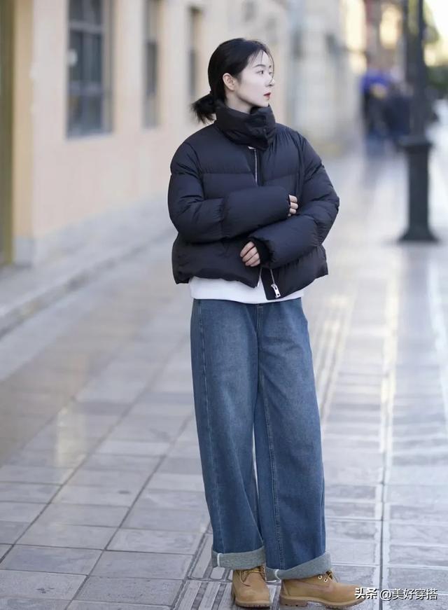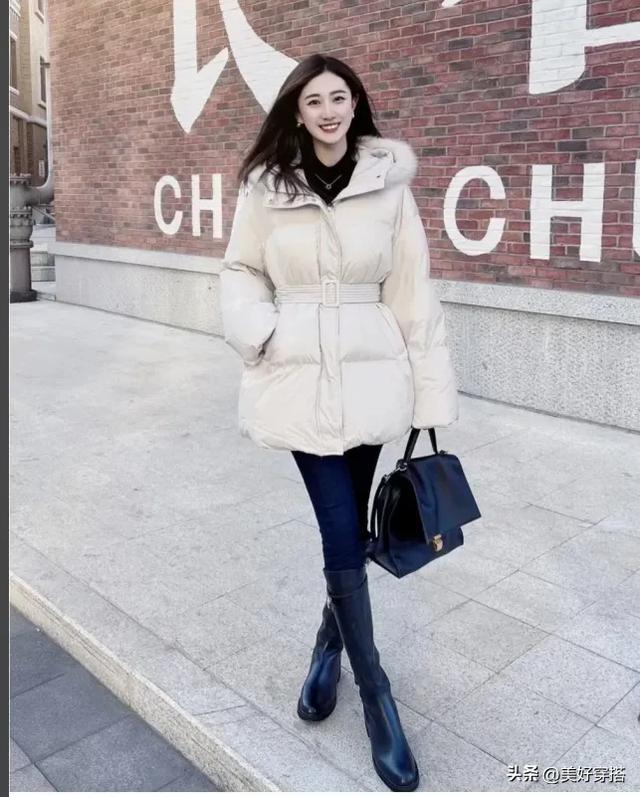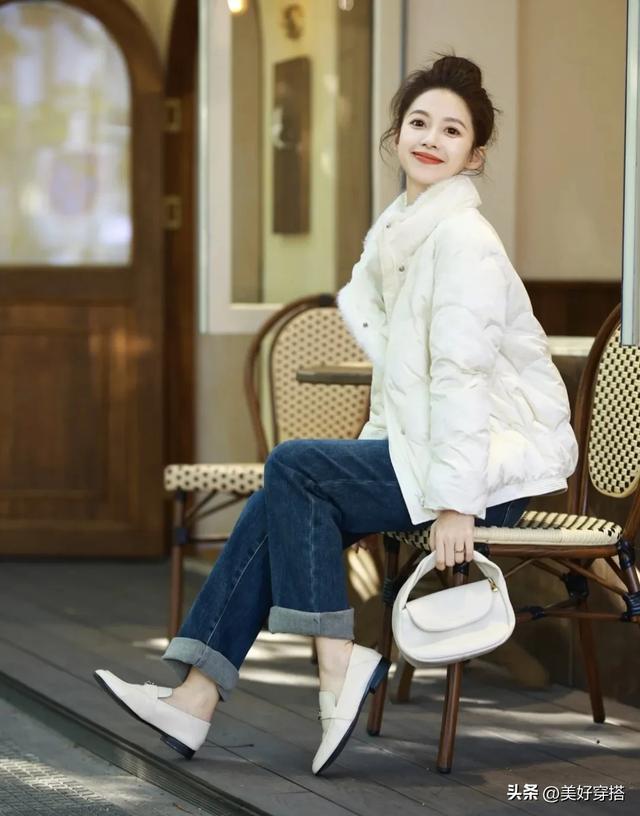 下半身你可以选择紧身的黑色或者蓝色牛仔裤,阔腿裤来搭配白色羽绒服。