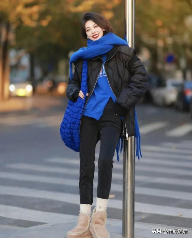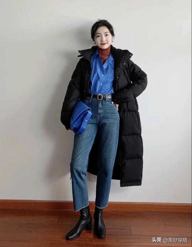 黑色搭配白色和蓝色内搭是最出彩的,当黑色的羽绒服遇上蓝色内搭,打破全黑的沉闷感,为整体造型增添一抹活力。