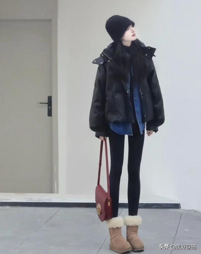 当然搭配黑色鲨鱼裤也是很好看的,再穿上一双棕色系的雪地靴,保暖又有氛围感。