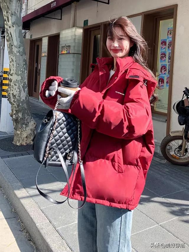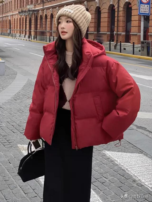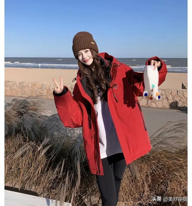 同样搭配一顶同色系的针织帽或是贝雷帽,不仅能保暖头部,还能与红色羽绒服相互呼应,增强整体造型的统一感。