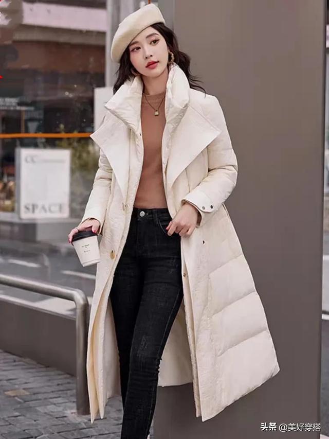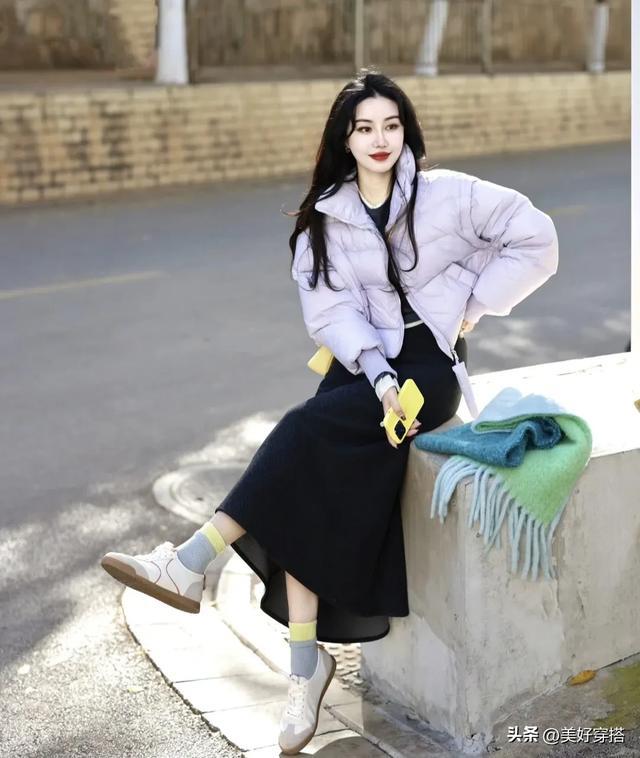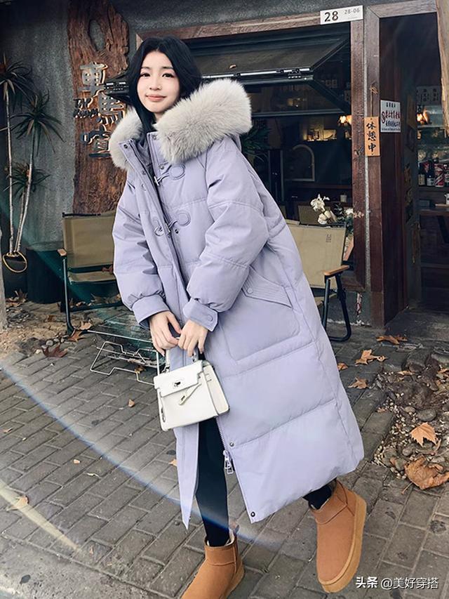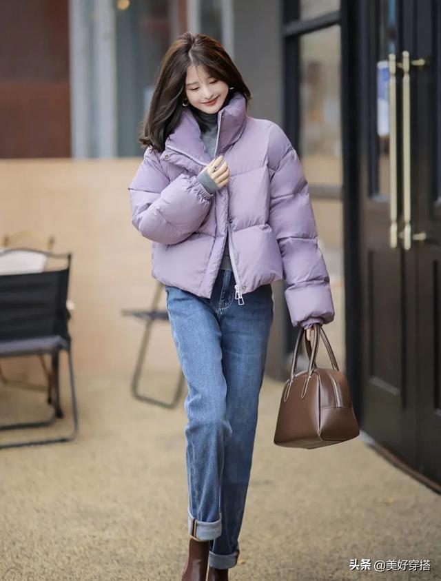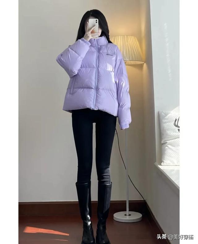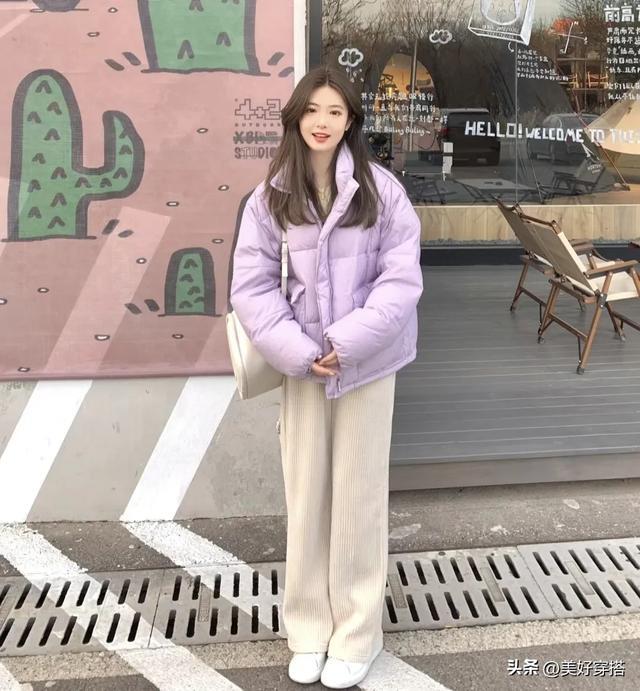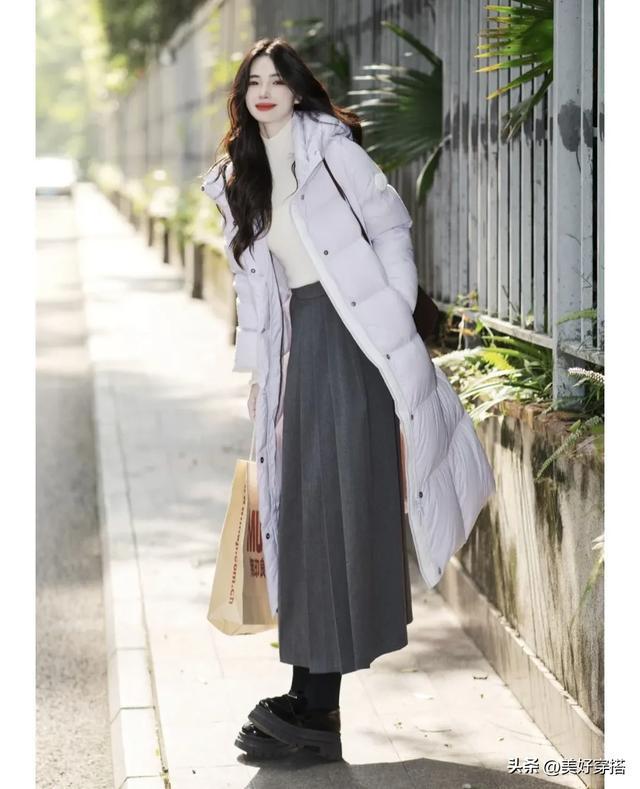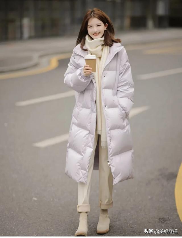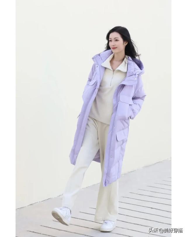 长款的浅紫色羽绒服会更保暖,特别是北方的宝子们,搭配一件白色的毛衣,下半身穿裙子和裤子都会显得优雅又简约。