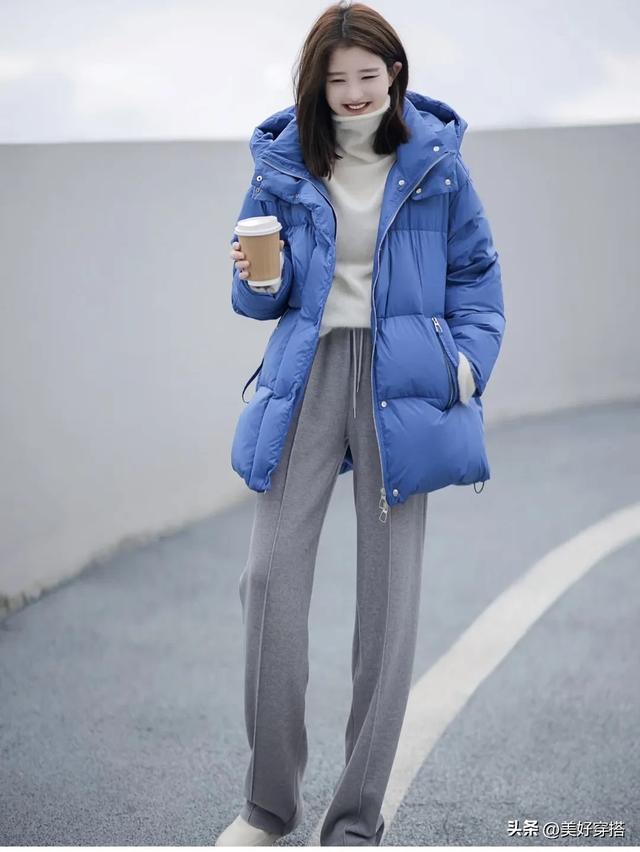 天蓝色的羽绒服,在视觉上更加层次分明,内搭一件白色或米色的高领毛衣,下半身穿一条灰色的运动裤或者休闲裤,增添一份轻松与惬意,也能够很好地衬托出蓝色羽绒服的清新气质。