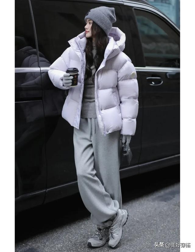 浅紫色的羽绒服在冬天里如同一抹温柔的梦境,轻盈地包裹着身体,既保暖又不失浪漫气息。