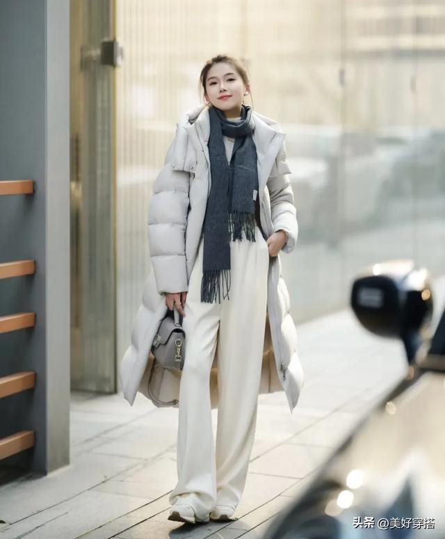 如果你不想把白色羽绒服穿得太沉闷,你可以选择一条饱和度高一点的围巾作为点缀。比如深灰色的围巾,既能与白色羽绒服形成鲜明对比,又能增添几分时尚气息。