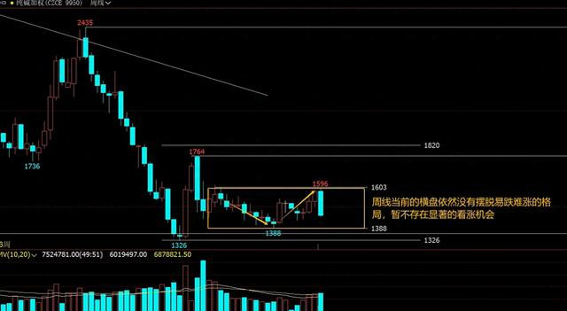 比较遗憾,本周以放量大阴线的形式收盘,再仔细观察1600-1388的横盘,可以发现,本周的阴线几乎要断送掉后市较长一段时间的看涨的可能性的机会了。